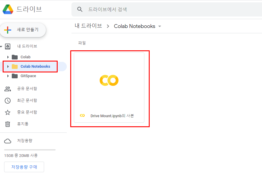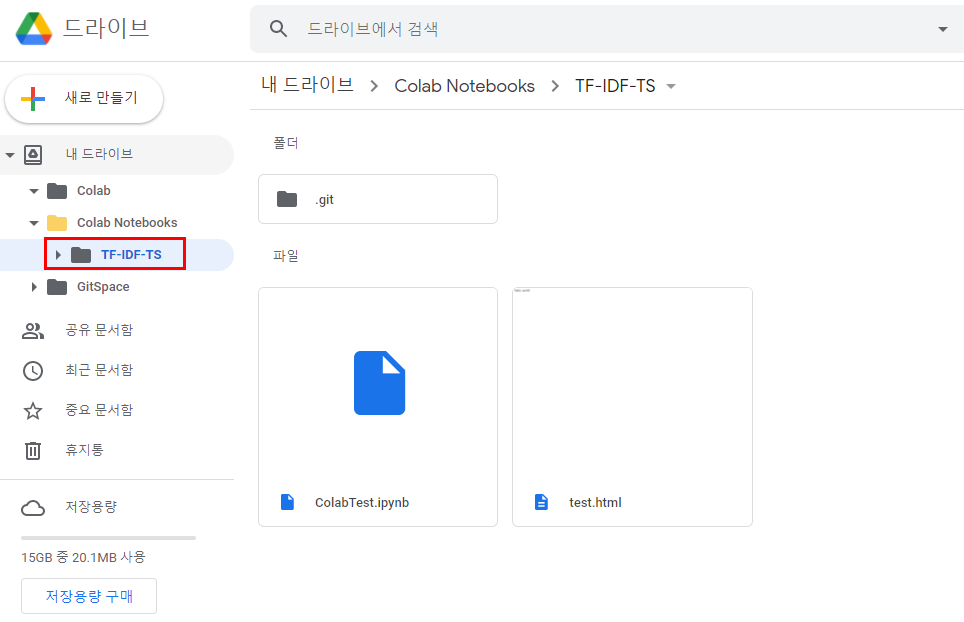 13) 구글 드라이브를 새로고침 하시면 클론받은 깃허브 프로젝트 폴더가 자신이 지정한 폴더 안에 생성되어있습니다!
