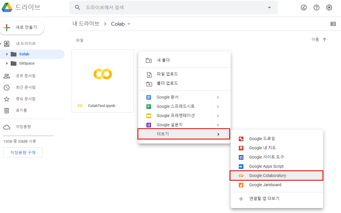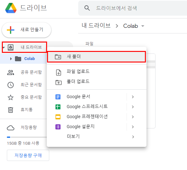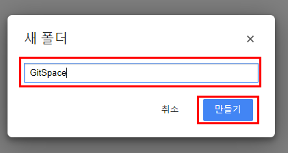 1. 내 드라이브 오른쪽 클릭 > 새폴더 클릭하여 새 폴더(GitSpace)를 만들어줍니다!