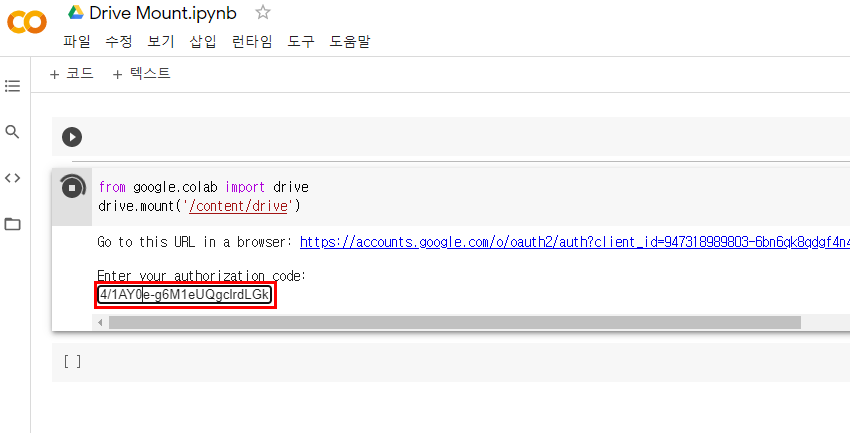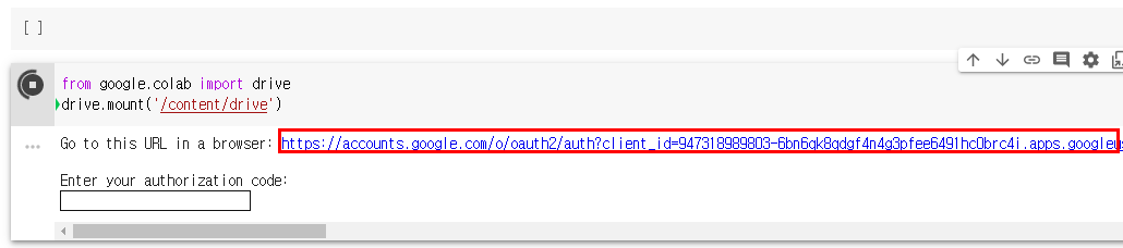 6) 위 코드를 실행한 값에 Go to this URL in a broser : "주소클릭" <- 주소를 클릭하여 로그인 등 인증을 받고 나면