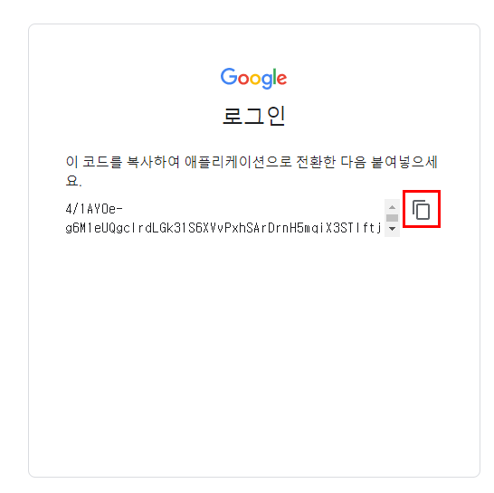 8) 다음과 같은 창이 열리면 코드를 복사합니다.