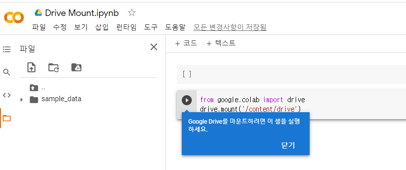 10) 마운트 완료! Colab Notebooks 폴더가 생성되었으며, Drive Mount.ipynb 파일의 사본이 생성되었습니다.