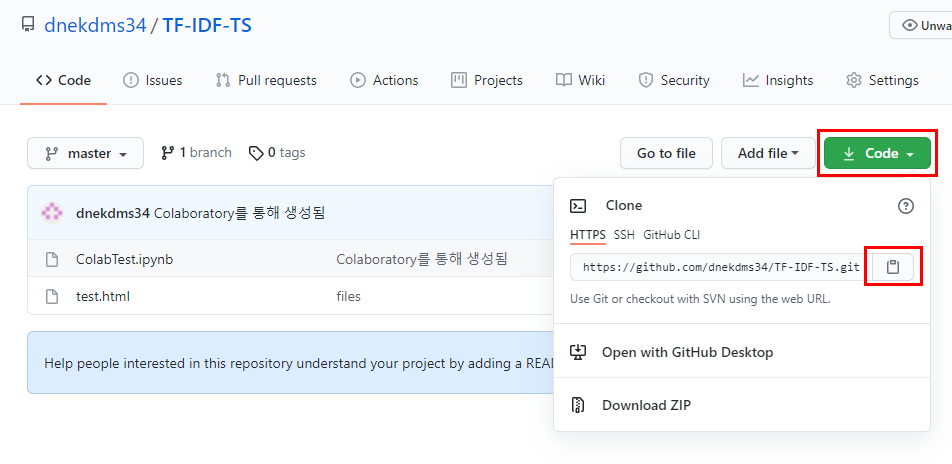 저는 테스트용으로 만든 프로젝트의 repository를 클론할 것 입니다. ( https://github.com/dnekdms34/TF-IDF-TS.git )