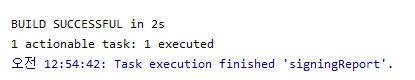 singingReport메뉴를 클릭하면 밑의 이미지와 같이 콘솔창에 SHA-1 키 값등 여러 값이 나오게 됩니다.