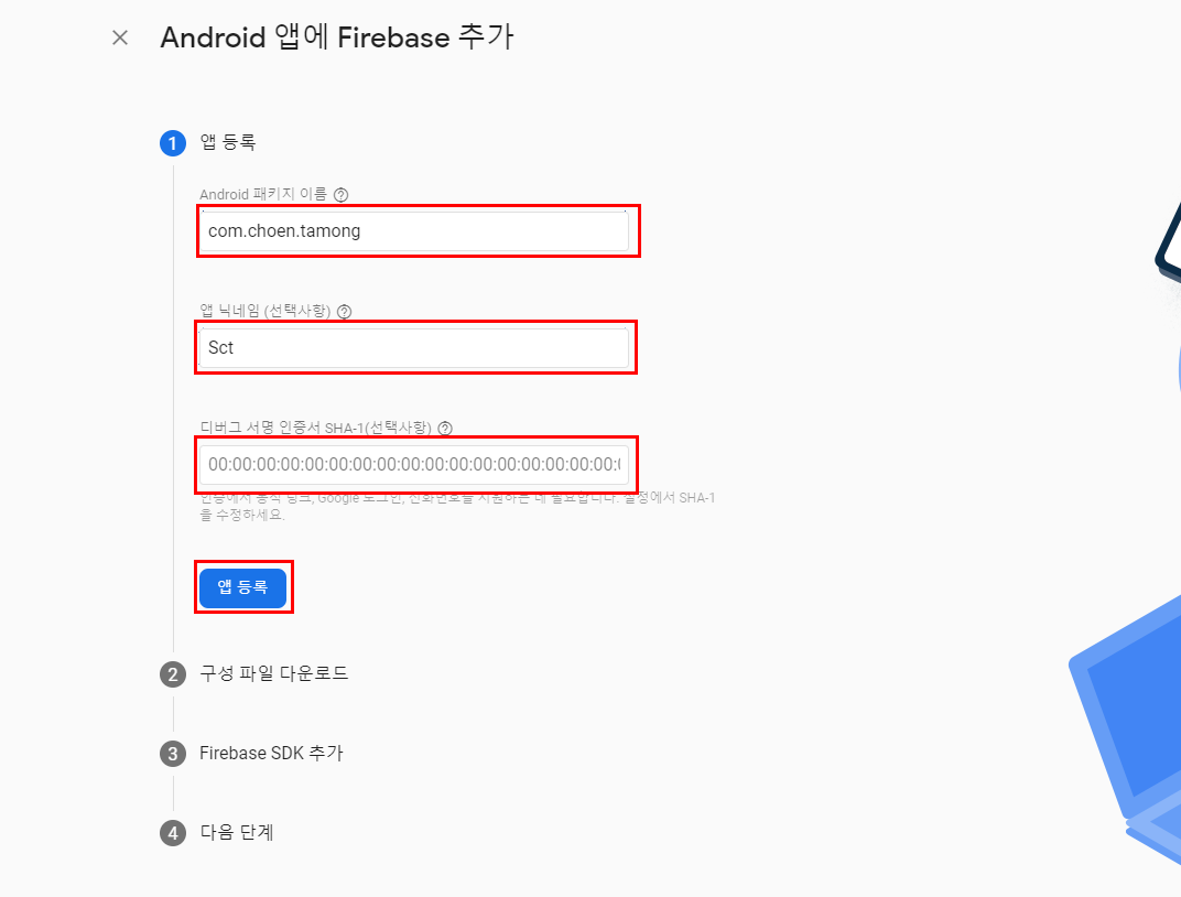 앱 닉네임과 디버그 서명 인증서 SHA-1키를 입력해줍니다.