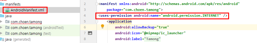 매니패스트에 인터넷 권한까지 추가해주면 준비 완료!