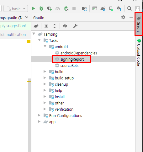 SHA-1키는 우측 상단의 Gradle -> Tasks -> android -> singingReport에서 확인할 수 있습니다:)