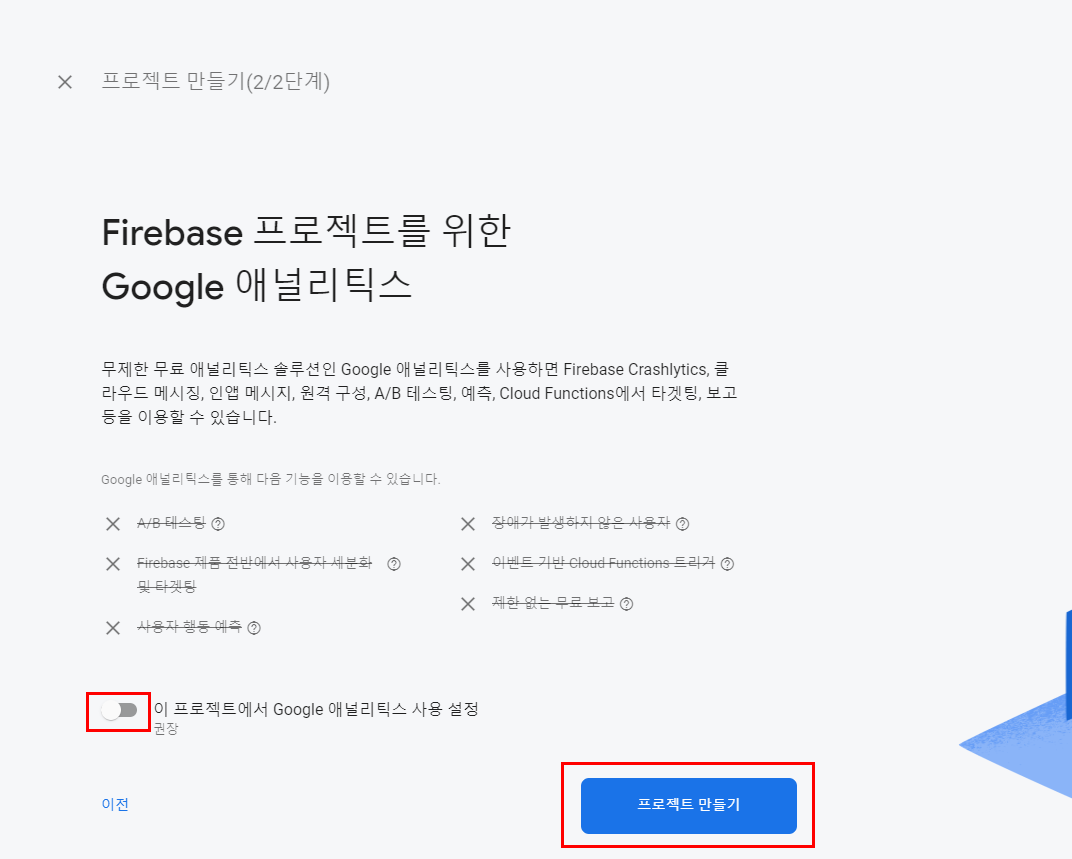 사용 설정을 안함으로 바꾼 후 프로젝트 만들기 버튼을 클릭합니다.