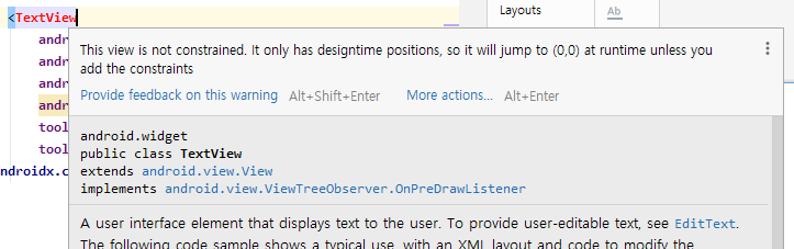 오류가 나는 버튼이나 텍스트뷰어(①)를 클릭 후 Infer Constraints버튼(②)를 클릭하면 된다.