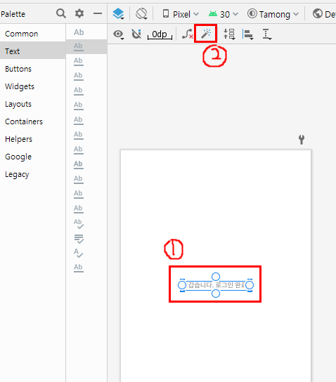 오류가 나는 버튼이나 텍스트뷰어(①)를 클릭 후 Infer Constraints버튼(②)를 클릭하면 된다.