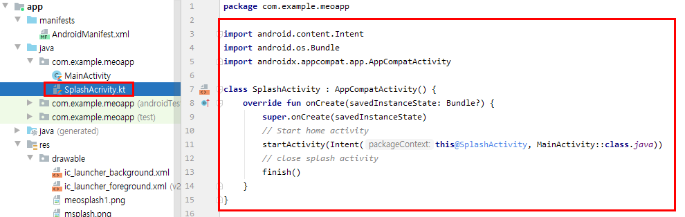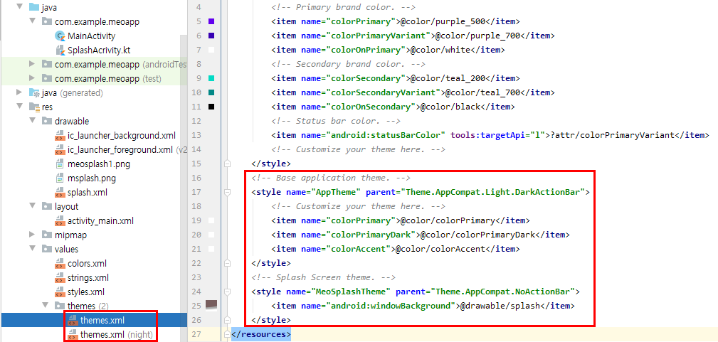 3) AndroidManifest.xml의 Activity에 MeoSplashTheme를 적용합니다.