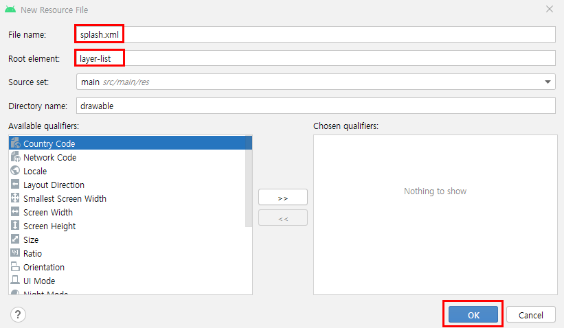 1) app>res>drawbale 폴더 안에 splash.xml 을 추가합니다.
