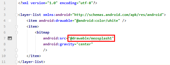 | <?xml version="1.0" encoding="utf-8"?> <layer-list xmlns:android="http://schemas.android.com/apk/res/android"> <item android:drawable="@android:color/white" /> <item> <bitmap android:src="@drawable/meosplash1" android:gravity="center"/> <!-- 자신의 만든 로딩 화면 이미지 경로를 넣습니다 --> </item> </layer-list> |